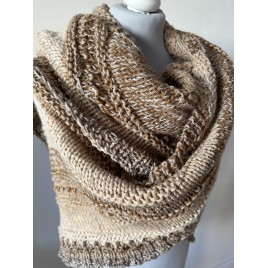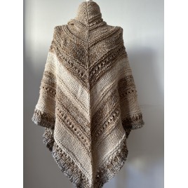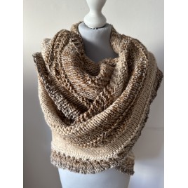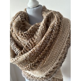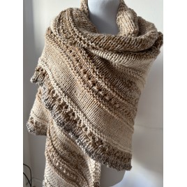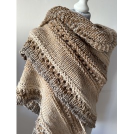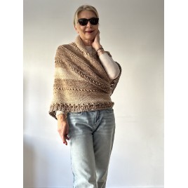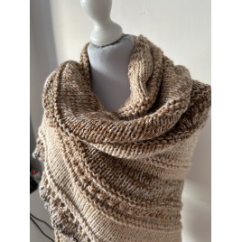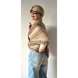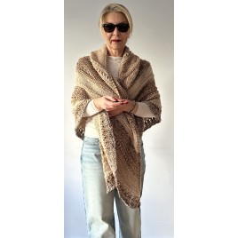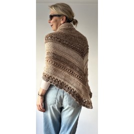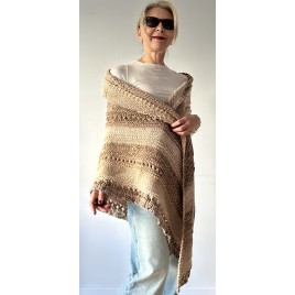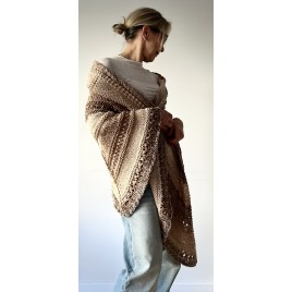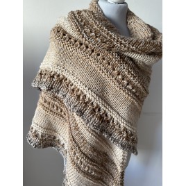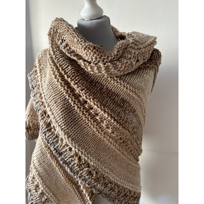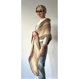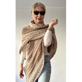Ta wyjątkowa chusta została wykonana ręcznie z miękkiej, ciepłej włóczki w naturalnych odcieniach beżu i brązu. Jej trójkątny kształt i obszerny rozmiar sprawiają, że jest idealna do noszenia na wiele sposobów – narzucona na ramiona jako eleganckie okrycie, zawiązana wokół szyi jako ciepły szal lub luźno puszczona jako stylowy dodatek do każdej stylizacji.
