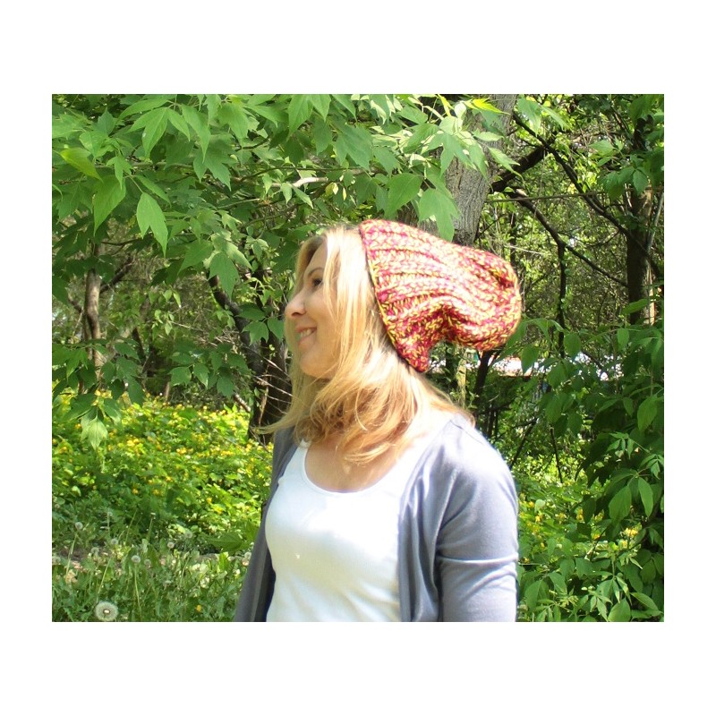 Kolorowa gruba czapka wykonana z miękkiej, ciepłej i bardzo przyjemnej włóczki, na drutach. Włóczka jest miła i przyjemna w dotyku.