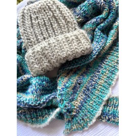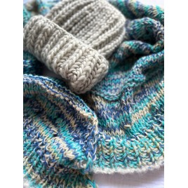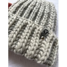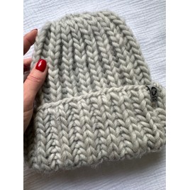 Oryginalna czapka, wykonana ręcznie na drutach z miękkiej włóczki w kolorze jasnym szarym.