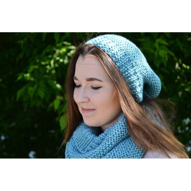 Dwu częściowy komplet składający się z czapki, podwójnie zwijanego komina. Zestaw wykonany w kolorze morskim. Bardzo miękki, ciepły i bardzo przyjemny, wykonany ręcznie na drutach włóczki nie mechacącej się:wełna/akryl, nie uczula. Włóczka jest miła i przyjemna w dotyku. Gotowy do wysyłki.
