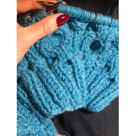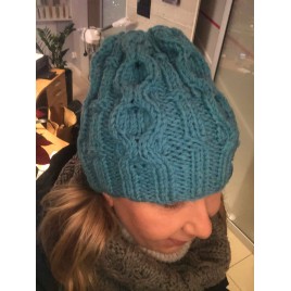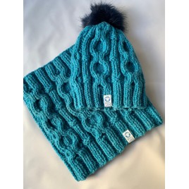 Komplet wykonany na drutach z dobrej jakości mieszanki wełna/akryl. Wzór i kolor tworzą fantastyczną całość. Komplet bardzo ciepły, włóczka mięsista i miła w dotyku.