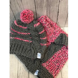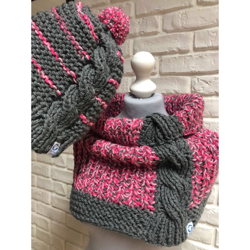 Komplet skład się z komina i czapki. Ozdobiony warkoczem dwustronnym. Zrobiony z mieszanki wełny z akrylem. Ciepły i mily w dotyku. Zrobiony ręcznie na drutach.