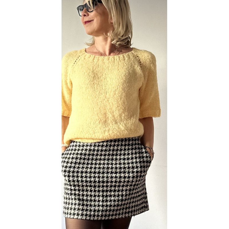 Delikatny sweter reglanowy z rękawami do łokcia. Wykonany na drutach z wysokiej jakości alpaki z jedwabiem z dodatkiem luksusowej nitki w kolorze żółtego złota z cekinami. Sweter jest miękki, delikatny i elegancki. Ten modny kolor będzie świetnie komponował się z wieloma kolorami w nadchodzącym sezonie wiosna -lato 2025!!!