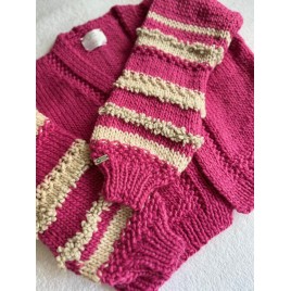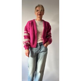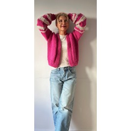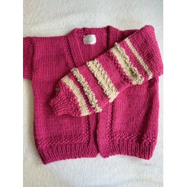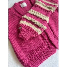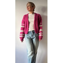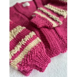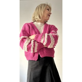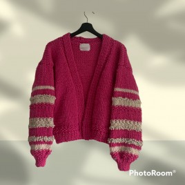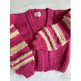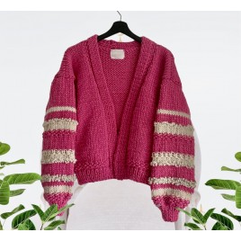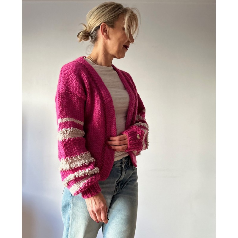 Piękny, krótki, różowy kardigan z fantazyjnymi rękawami. Wykonany na drutach z wełny 100%. Włóczka jest jest miła i delikatna. Osoby bardzo wrażliwe może delikatnie drapać.